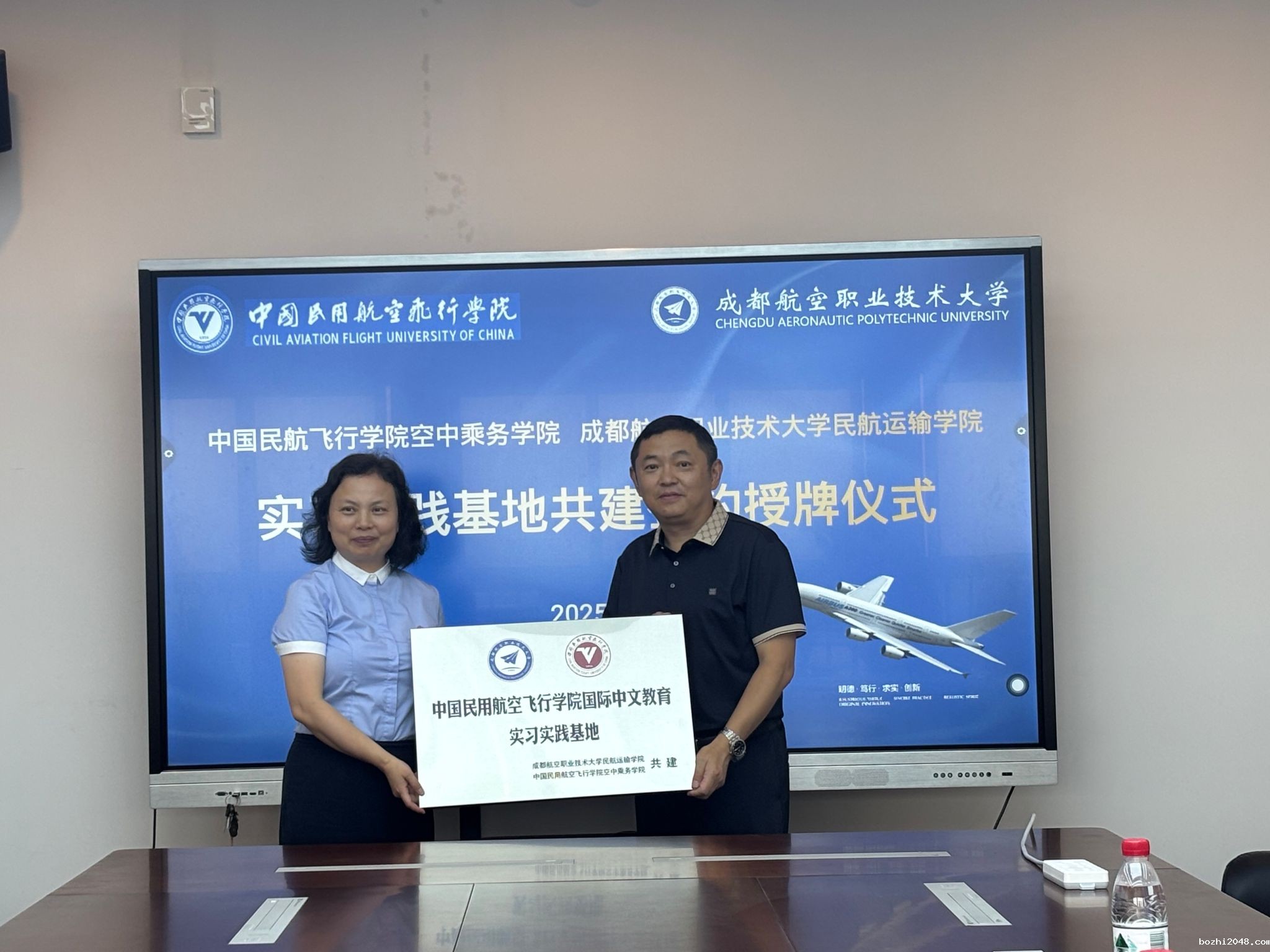 7月2日下午,民航运输学院与中国民航飞行学院空中乘务学院实习实践基地共建签约授牌仪式在成都航空职业技术大学顺利举行。中国民航飞行学院空中乘务学院党委书记胡涛、副院长于蓉、教研室副主任杨锐,民航运输学院特聘院长智小冬、学院行政负责人洪德慧、学院教学工作负责人杨菲出席了仪式。